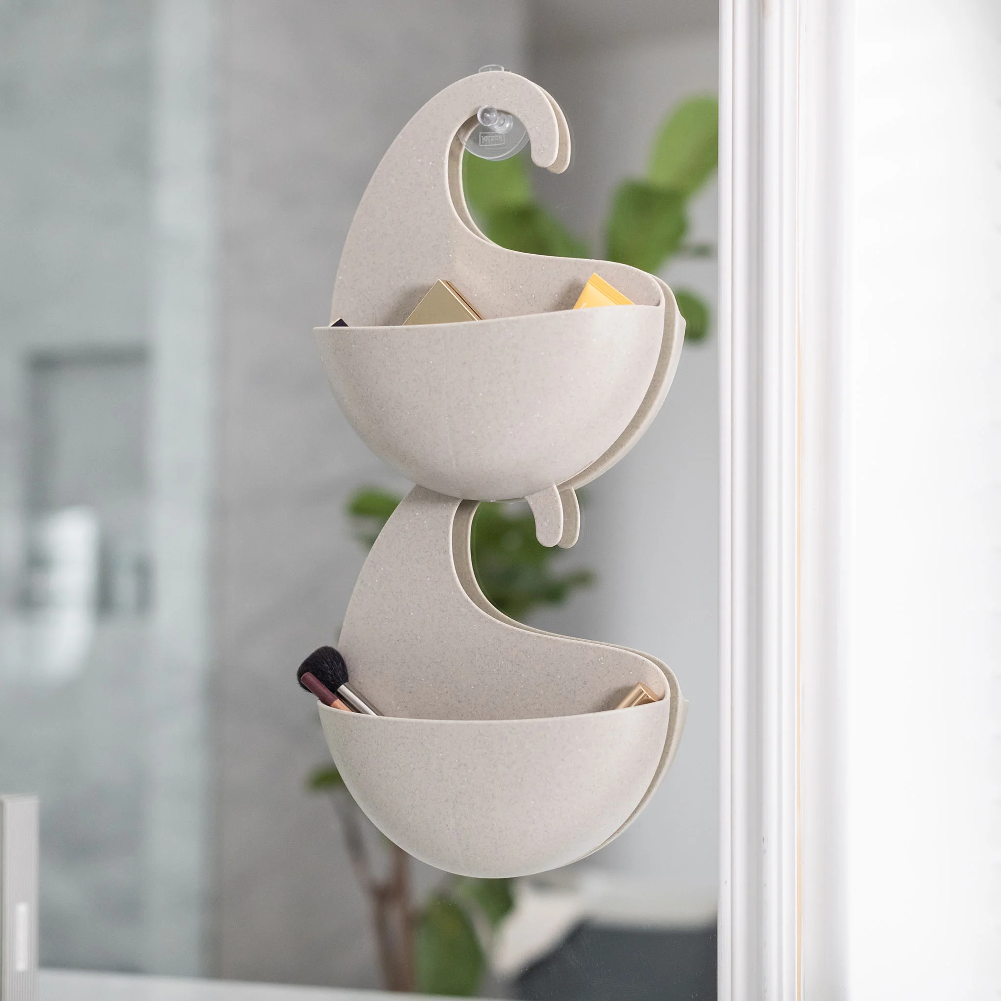 Mit seinem schwungvollen Haken lässt sich SURF M an die Armatur von Badewanne oder Dusche hängen. Doppelt trickreich sind die Schlitze an der Unterseite: hier kann das Wasser ablaufen und zudem ein weiteres SURF Utensilo angekoppelt werden. Viel Platz für Shampoo, Duschgel und mehr. SURF M besteht zu 100% aus recyceltem Kunststoff sowie Zellulose und spart damit mehr als zwei Drittel CO₂ im Vergleich zu neuen Materialien ein.